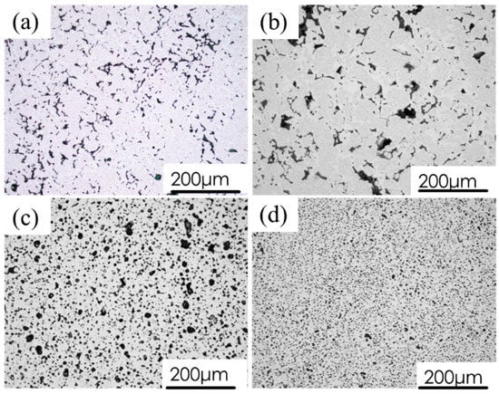 Figure 9 shows the OM micrographs of the as-sintered NiMnFeCu at various sintering conditions. It is seen that the S1–S3 alloys are porous. The information regarding the pore size and the morphology for the sintered NiMnFeCu HEAs (S1–S4) are summarised in Table 3. The average pore sizes of S1 and S2 were 34.7 μm and 37.3 μm, respectively, and the morphology of the pores of S1 and S2 remained irregular. The average pore sizes of S3 and S4 were 11.2 μm and 8.1 μm, respectively. The morphology of the pores of S3 and S4 changed to spherical. The sintered relative densities of S1 and S2 were 79% and 82%, respectively, and the sintered relative density values of S3 and S4 were 80% and 98%, respectively.