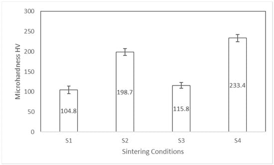 Figure 10 depicts the mean and standard deviation of micro-hardness measurements of NiMnFeCu HEA under sintering conditions S1–S4. It can be seen that the micro-hardness of HEA made under condition S4 is higher when compared to those HEAs made under conditions S1–S3. The mean and standard deviation of micro-hardness of S1 and S2 were 104.88 ± 9 Hv and 198.79 ± 8 Hv, respectively, and for S3 and S4 the micro-hardness values were 115.28 ± 7 HV and 233.45 ± 9 HV, respectively.