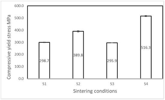 Figure 11 shows the compressive yield stress of the as-sintered NiMnFeCu under various sintering conditions. It appeared evident that the condition S4 possessed greater yield strength when compared to all other sintering conditions (S1–S3). For the conditions S1 and S2, the alloy yielded at 298.7 MPa and 389.8 MPa, respectively, and for S3 and S4 the alloys possessed a yield stress of 295.9 MPa and 516.3 MPa, respectively.