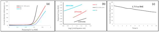 Electrochemical characterization of the as-sintered NiMnFeCu at various sintering conditions. (a) Linear sweep voltammetry curve at the scan rate of 5 mV, (b) Tafel slopes derived from LSV curves, (c) chronoamperometry curve of the as-sintered NiMnFeCu (S2) at constant potential 1.7 V (vs. RHE).