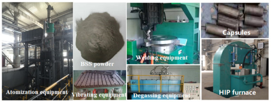 The powder was placed in the capsules, which were welded by using Q235 steel according to Chinese Standard GB/T 700 (2006, Standardization Administration of the P.R.C., Beijing, China). The capsules were placed on the vibrating equipment to obtain higher tap density. Filled with BSS powder the capsules were heated to 500 °C in the atmospheric oven and degassed to 10−3 Pa to reduce oxidation of the powder. Held for one hour, the capsules were sealed. One capsule was placed individually in the HIP furnace and then heated up and one package was placed individually in the HIP furnace and then heated up and elevated pressure and held at sintering temperature and maximum pressure (110 MPa) for 2 h, as shown in Figure 4 for HIP process. The billets after sintering were cooled naturally in the HIP along with the furnace for approximately 6–10h and then taken out of the furnace below 150 °C. In this study there were six sintering temperatures: 600, 700, 900, 1000, 1100, and 1160 °C, designed to observe such characteristics such microstructure at different HIP sintering temperatures. Subsequent tests were carried out after the capsules were removed. In Figure 1 are shown photos of vibrating, welding, degassing equipment and HIP furnace.
