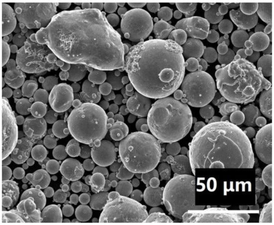 The Fe-Cr-Ni austenite with boron in accordance with Standard 304B7 of ASTM A887(2004, ASTM International, West Conshohocken, PA, USA) powder was obtained by atomization equipment, (Advanced Technology & Materials Co., Ltd., Zhuozhou city, China) as shown in Figure 1: Fe-B, Fe-Cr and other raw materials were put into the melting furnace (Advanced Technology & Materials Co., Ltd., Zhuozhou city, China) to melt and then were ejected, and the furnace was filled with protective argon gas so that the oxygen content of powder was low, approximately 200 ppm. The gas atomization powder obtained was passed through the 74 μm sieve, as shown in Figure 1. The powders were mostly spherical in shape, as shown in Figure 2. The elemental contents of boron, chromium, nickel etc. are shown in Table 1. The powder particle size distribution was tested by light scattering according to ASTM B822, as shown in Figure 3, which was the percentage of the volume content of the different particle sizes of the powder. Bulk density of powder was 4.53 g/cm3, tested according to ISO 3923-1; tap density of powder was 5.15 g/cm3, tested according to ISO 3953.