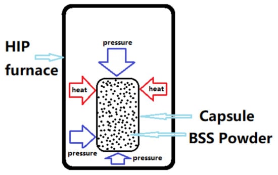 The PM (powder metallurgy) process is better than the casting process to prepare BSS with more uniform distribution of boron elements, finer grains, and higher mechanical properties. Hot isostatic pressing (HIP) sintering is the process to densify powders or cast and sintered parts in the furnace under both high pressure (100–200 MPa) and high temperatures for example special steels, superalloys, ceramics etc. [17]. The temperature of the powder sintering by HIP is generally greater than 0.7Tm (Tm: melting point) [18]. The pressure of HIP (typically approximately 100 MPa) is much greater than the driving force of closure among powder [18], therefore dense materials by HIP can be obtained at a lower temperature than pressureless sintering due to the combined effect of temperature and pressure [19]. The densification of the powder occurs mainly during the step of raising and holding temperature and pressure. The powder in most region flows centrally in the powder densification, but there is a complex flow around the edge of capsule, so that the final HIP sintering may be somewhat uneven in density [20]. The material, which is made from HIP densification of gas atomized have smaller and more homogeneous grains and have higher tensile, strengths, ductility, and toughness than conventionally processed material [21,22]. Oxygen element cannot be reduced during HIP sintering which is harmful element that can lead to small pores in the microstructure and there is a linear relationship between the oxygen content and the area fraction of the pores [23]. Therefore, it is necessary to minimize the oxygen content of the powder to improve the properties of HIP sintering materials. A number of process parameters and material properties of powdered stainless steel were investigated after HIP [24,25,26,27,28].