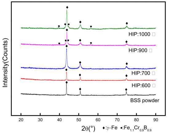 Figure 6 shows the X-ray diffraction (XRD) patterns of BSS powder and the alloy after HIP sintering at different temperature: 600, 700, 900, and 1000 °C. The BSS powder was supersaturated solid solution and the phase was austenitic. After undergoing HIP at 600 °C and 700 °C, alloy remained as single phase (austenitic) and no precipitation occurred; in comparison with Thermo-Calc software (2021a, Thermo-Calc Software, Solna, Sweden) calculations, no M23C6 and M2B phases appeared, the mainly reason was insufficient time of precipitation at lower temperatures. After experiencing HIP sintering at 900 °C, the boron phase was generated and the alloy consisted of two main phases: austenite phase and borides (Fe1.1Cr0.9B0.9), and the latter was orthorhombic phase and generated above 900 °C of HIP temperature. Fe1.1Cr0.9B0.9 and austenite phase were always present during the heat treatment and the proportion of them didn’t change [5], while the Fe1.1Cr0.9B0.9 phase proportion during HIP started to increase from zero at 700 °C. The XRD peaks of γ-Fe was broaden above 700 °C.
