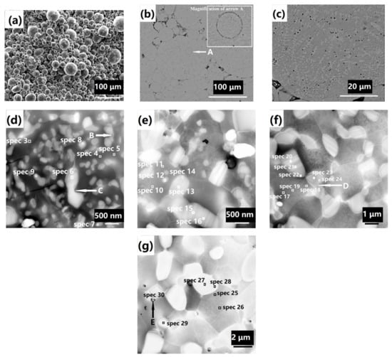 Microstructure and EDS (energy-dispersive spectroscopic) point analysis of BSS after HIP sintering at six temperatures: (a) 600 °C, (b) 700 °C, (c) 700 °C, (d) 900 °C, (e) 1000 °C, (f) 1100 °C, and (g) 1160 °C.