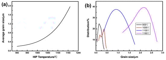 (a) Average grain size change at different HIP sintering temperature from 900 to 1160 °C; (b) grain size distribution at 900, 1000, 1100, and 1160 °C.