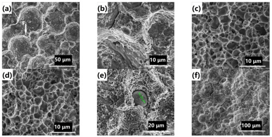 Figure 13a–f shows the fracture morphology of HIP sintering from 900 to 1160 °C. The fracture morphology at 900 °C shows that there were many circular pits with white bright annular bands on the sides, as is shown in Figure 13a. Pointed by arrow F, the area was magnified with many small transgranular fractures, as shown in Figure 13b. In comparison with that of Figure 11d, these small (less than 1 μm) transgranular fractures should be the boron-containing phase, whose size was tens to hundreds of nanometers in Figure 11d. Analysis of Figure 13a,b showed that the boron-containing phase was mainly distributed on the edges of the round microstructure in Figure 13a (the bright circular bands of the edge); the boron-containing phase was also present inside the round microstructure, because the internal surface of the circular microstructure was not smooth in Figure 13b. Adjacent to the round microstructure, the small size of the boron-containing near the round microstructure was responsible for the lower elongation at 900 °C (3%); the boron-containing phase inside the round microstructure was responsible for the highest yield strength at 900 to 1000 °C (556 MPa). The fracture surface at 1000 °C was similar to that of 1100 °C, and the size of fracture grains ranged between below 1 µm to 5 µm. The absence of the round microstructure like 900 °C (size in the range of 10–50 µm) in the 1000 °C and 1100 °C fracture morphology indicated that the boron-containing phase had firstly grown and secondly was more evenly distributed in the austenite. A spherical shape of approximately 14 μm was found in the fracture surface of 1160 °C, which was surrounded by small transgranular fracture with surface smooth, as is shown in Figure 13e. Micro microstructure similar to aforesaid can be observed too in the fracture surface, which accounted for the elongation at 1160 °C, lower than that at 1100 and 1000 °C, as is shown in Figure 13f.