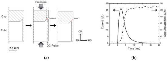 (a) A solid-state joint is formed from simultaneous pressure and resistive heating at a narrow contact point, shown in cross-section. (b) Representative pulse current and cap displacement measured during CDRW. Note that cap movement is delayed versus current, reflecting the time for material to heat and soften, and finishes before the pulse completely dissipates, indicating that the remaining current is insufficient to heat the broadened contact and sustain flow.