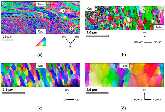 (a) EBSD grain orientation map (relative to TD) showing the lack of significant grain recrystallization or coarsening at the weld line. Highlight 1 marks a cluster of recrystallized grains along the weld line, whereas highlight 2 indicates another example of enlarged cap grains caused by the heterogeneity of hot extrusion. (b–d) TKD grain orientation maps showing material across the weld line, in the cap near the weld (~10 μm away), and in the tube near the weld, respectively. Here, all maps were collected from joints produced using Weld Condition 1 and colored according to the crystal orientation parallel to the indicated viewing direction for each map. Note the difference in sample orientation (i.e., frame of reference) between (b,c) and the accompanying change in appearance for the cap grains.
