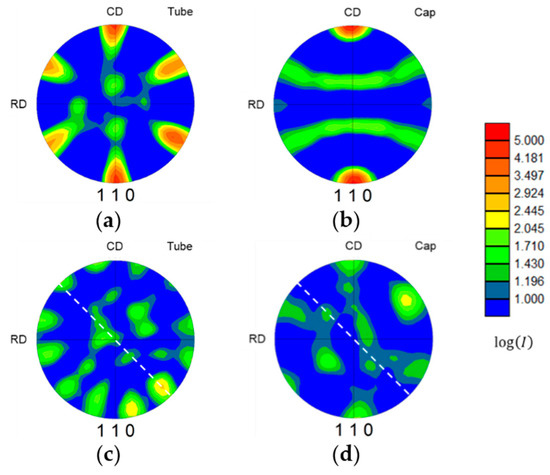 (a,b) Pole figures showing ⟨110⟩ alignment with the sample directions (CD, RD, TD) in the unaltered base tube and cap materials, respectively. (c,d) Comparable pole figures generated from material in the TMAZ of each material. Dashed white lines have been added to highlight the plane of the weld line. Texture intensity, I, has been plotted using a logarithmic color scale to highlight the extreme shift between base and TMAZ materials. Here, pole figures are taken from a joint produced using Weld Condition 3.