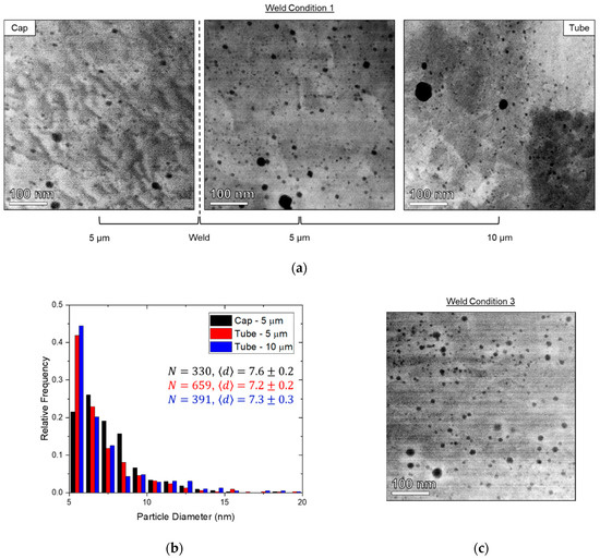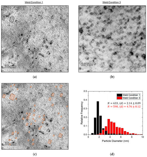 A particular effort was made to examine dispersed oxide distributions from CDRW joints produced at varied weld energies and powers, given the importance of heat input to SSW performance [52,63,72]. Comparisons of Weld Conditions 1 (“cold”) and 3 (“hot”) are shown in Figure 5a vs. Figure 5c for larger dispersoids and in Figure 6a vs. Figure 6b for nano-oxides. While the larger dispersoids appear qualitatively similar in these joints (i.e., size range, uniform distribution), nano-oxides appear larger in the Weld Condition 3 material (~5 nm vs. ~2 nm Ø), as presented in the nano-oxide size distributions in Figure 6d. This change in nano-oxides, but not larger particles, could be attributed to the very short duration of the CDRW process (≲20 ms), with sufficiently high local temperatures for Y and Ti diffusion but an insufficient time for long-range transport. However, it must be noted that the hot sample foil imaged here is also thicker (~2x) than the Weld Condition 1 material. Due to the fact that the visibility of nano-oxides depends on sample thickness (i.e., less fraction of the thickness → less contrast), the observed difference in size distribution may be artificial and the smallest nano-oxides (i.e., <2 nm Ø) may be undercounted in general.