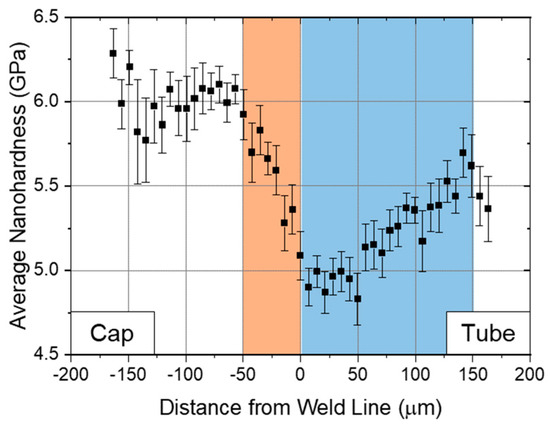 Nanoindentation measurements with distance from the weld lines of CDRW joints, based on 720 measurements across six joints produced using Weld Conditions 1–3. Note the expected difference in hardness between cap and tube materials (~6.0 vs. ~5.5 GPa) and the noticeable softening of material in the cap and tube TMAZs (shaded).