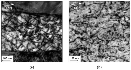 Bright-field TEM images of the 14YWT tubing used in this study, showing a possibly greater dislocation density in as-pilgered base material (a) than in post-CDRW material within 20 μm of a joint (b) formed using Weld Condition 3. The g = ⟨011⟩ diffraction vector was excited for imaging.
