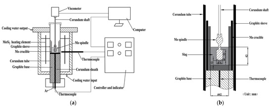 In this paper, we used the rotating column method to determine viscosity. Figure 1a,b show the experimental equipment and the sizes of the molybdenum crucible and spindle, respectively. The molybdenum spindle can be rotated using a corundum shaft attached to a digital viscometer (DV2TRV, Brookfield Engineering Labs., Inc., Middleborough, MA, USA), which was mounted on a lift, allowing the spindle to be submerged and removed from the slag. To prevent slag’s oxidation at high temperatures, a high purity graphite sleeve was placed between the corundum tube and molybdenum crucible. The slags were melted in a vertical resistance furnace with six U-shaped MoSi2 heating rods. A type B thermocouple (Pt−10 wt% Rh/Pt−13 wt% Rh) enclosed in a corundum sheath was placed directly below the crucible’s bottom and maintained within ±3 K of the target temperature in real-time using a PID controller. Before measurements, the viscometer was calibrated at room temperature with standard castor oils of varying concentrations.