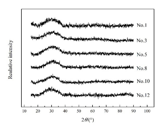 Figure 2 shows the X-ray diffraction (XRD; D8 ADVANCE, Bruker, Rheinstetten, Germany) profile of the quenched slag, which confirms the amorphous state of the sample and represents the structure of the slag at high temperatures. According to the results presented in Table 1, the chemical composition of the quenched samples reveled by X-ray fluorescence spectroscopy (XRF, ZSX Primus II, Rigaku Corporation, Tokyo, Japan) exhibits no significant changes before and after the experiment. It should be noted that the almost negligible MoO3 content shown by XRF confirms that there is no significant chemical reaction between molybdenum and iron. Therefore, MoO3 can be ignored during the viscosity measurements. In our experiments, the maximum measurement error of XRF did not exceed 0.5%. The classical K2Cr2O7 titration method was used to determine the presence of Fe2+ in quenched slag. The Fe3+ content of the slag is calculated by subtracting the Fe2+ content from the total Fe content. In addition, the microstructure of the quenched slag was characterized through FTIR (VERTEX70, Bruker, Rheinstetten, Germany) and Raman (HR800, Jobin Yvon, Palaiseau, France) spectroscopy.