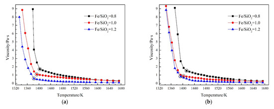 Figure 11b shows the slag viscosity predicted using Factsage 7.3, which is consistent with the experiments at high Fe/SiO2 ratio. However, no amphoteric behavior of Fe2O3 was observed at low Fe/SiO2 ratios according to the software calculations, which may be due to the deviation of the viscosity model used by the software from the actual measurement results.
