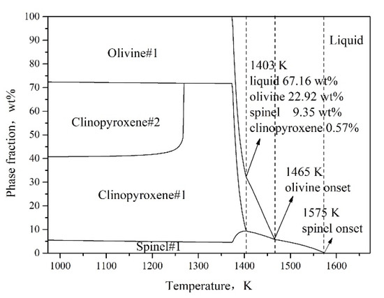 The calculated cooling phase equilibrium of the slag at 1673–973 K (Fe/SiO2 = 1.0, Fe2O3 = 8 wt%) is given in Figure 5. According to Figure 5, with cooling, the spinel phase began to precipitate at 1575 K, accounting for 0.04%. The iron olivine phase began to precipitate at 1465 K, accounting for about 0.41%, at which time the spinel precipitation had reached 5.89%. With the continuation of cooling, the pyroxene phase began to precipitate at 1403 K, accounting for 0.57%, at which time the spinel accounted for 9.35% and the iron olivine phase accounted for 22.92%. It can be seen that with the continuous cooling, the type and quantity of solids precipitated from the slag are increasing, thus causing the slag viscosity to rise continuously.