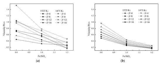 The viscosity of the FeO−Fe2O3−SiO2−8-wt% CaO−3-wt% MgO−3-wt% Al2O3 melt concerning Fe/SiO2 ratio at 1523 and 1473 K is shown in Figure 6a. The viscosity of all slags decreases with increasing Fe/SiO2 ratio at a given temperature, and this trend is more pronounced at low temperatures and Fe/SiO2 ratios, whereas at high temperatures and Fe/SiO2 ratios, this effect becomes less significant. For example, at a low temperature of 1473 K and Fe2O3 content of 16 wt%, the viscosity decreases remarkably by 0.75 Pa·s with increase in Fe/SiO2 ratio from 0.8 to 1.0. However, when Fe/SiO2 ratio continues to increase to 1.2, viscosity decreased by only a small amount of 0.31 Pa·s. At a higher temperature of 1523 K, the viscosity decreases by 0.42 Pa·s when Fe/SiO2 increases from 0.8 to 1.0, which is weaker than that at 1473 K. Continue to increase Fe/SiO2 to 1.2, the viscosity change is 0.27 Pa·s, which also became relatively weaker.