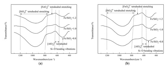 As visible in Figure 7a, the lower limit of the characteristic symmetric stretching vibration band of [SiO4]4− tetrahedra shifts from 778 to 755 cm−1 with increasing Fe/SiO2 ratio from 0.8 to 1.2 at 12 wt% of Fe2O3. In particular, the convoluted band’s width widens and intensity decreases, implying an increase in the spacing of Si and O in the [SiO4]4− structure and depolymerization of the slag structure. Furthermore, as Fe/SiO2 increases, the groove depth of the Si−O vibration band at approximately 500 cm−1 becomes shallower, revealing the disappearance of the complex silicate structure.