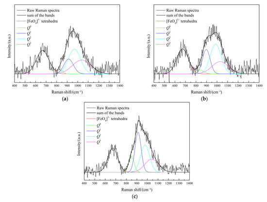 Deconvolution schematic of Raman spectrum of quenched samples at Fe2O3 content of 8 wt% with various Fe/SiO2 ratios of (a) 0.8; (b) 1.0 and (c) 1.2.