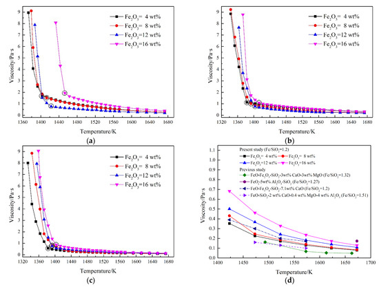 Viscosity changes versus temperature of the FeO−Fe2O3−SiO2−8 wt%CaO−3 wt%MgO−3 wt%Al2O3 system at different Fe2O3 content and fixed Fe/SiO2 ratios of (a) 0.8; (b) 1.0; (c) 1.2; (d) comparison with other studies (Fe/SiO2 = 1.32 data from [12], Fe/SiO2 = 1.27 data from [24], Fe/SiO2 = 1.2 data from [40], Fe/SiO2 = 1.51 data from [41]).