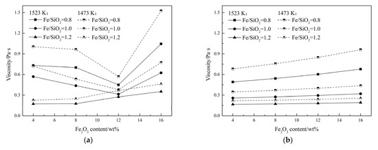 Figure 11a depicts the effect of Fe2O3 content on slag viscosity at various temperatures and fixed Fe/SiO2 ratios. It can be seen that for Fe/SiO2 ratios of 0.8 and 1.0, the slag viscosity shows a minimum value with the increase of Fe2O3 content. For example, at a Fe/SiO2 ratio of 0.8, the viscosity decreases from 0.73 to 0.45 Pa·s as the Fe2O3 content increases from 4 to 12 wt%, and increases sharply to 1.04 Pa·s as the Fe2O3 content continues to increase to 16 wt%. Moreover, as Fe/SiO2 ratio rises to 1.2, the slag viscosity follows a different trend, i.e., it increases with the addition of Fe2O3. This can be attributed to the amphoteric behavior of Fe2O3.When the Fe/SiO2 ratio is relatively low, Fe2O3 behaves similarly to other basic oxides, which can decompose network-modifying O2− at high temperatures and react with the bridge oxygen in the slag; thus, depolymerizing the slag and lowering the slag viscosity. When Fe/SiO2 ratio is high, Fe2O3 exhibits the properties of acidic oxides, such as SiO2, and the [FeO4]5− tetrahedra forms a more complex network structure with the [SiO4]4− tetrahedra, making the slag more aggregated with increased slag viscosity.