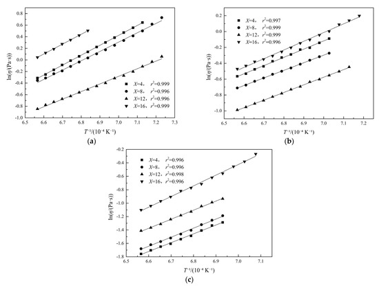 where η is the viscosity, Pa·s; A is the pre-exponential constant; Eη is the activation energy for viscous flow, J·mol−1; R is the universal gas constant, 8.314 J·(mol·K)−1, and T is the absolute temperature, K. The changes in Eη can provide a reference for variation in friction of viscous flow and can express the slag structure changes [42].