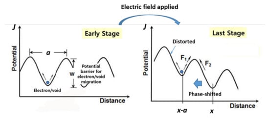 Fatigue, in other words, may originate from material flaws–electron/void–that are created on a macro or microscopic scale. From such a theoretical point of view, it can be explained as transport processes such as the diffusion of shallow level dopants of silicon in semiconductors, which are called non-equilibrium thermodynamics. As a driving force such as an electric magneto-motive force, ξ, is exerted, the impurities such as voids in materials, created by electronic movement, are effortlessly migrated because the barriers of junction energy are reduced and distorted/phase-shifted (Figure 6).
