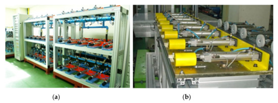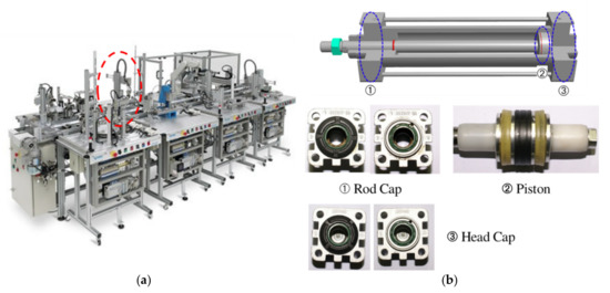 Pneumatic cylinder in automatic assembly line: (a) automatic assembly line, (b) main parts.