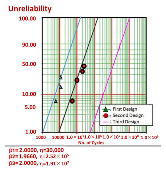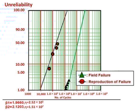 For approximating characteristic life, η, in Equation (A2), the Weibayes model by using Weibull examination is a widely acknowledged method of inspecting reliability data. That is, the entire instances as failures (r ≥ 1) and no failures (r = 0) need to be split. As a result, it is feasible to approximate the characteristic life.