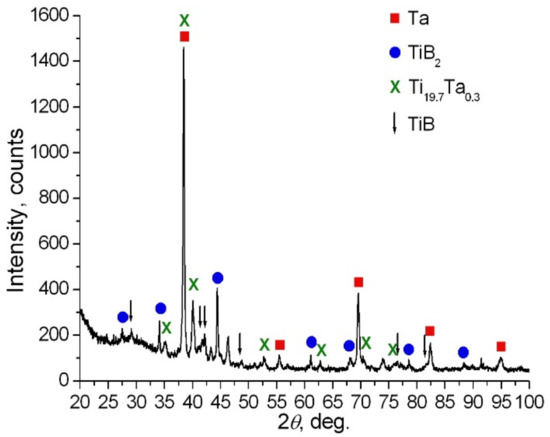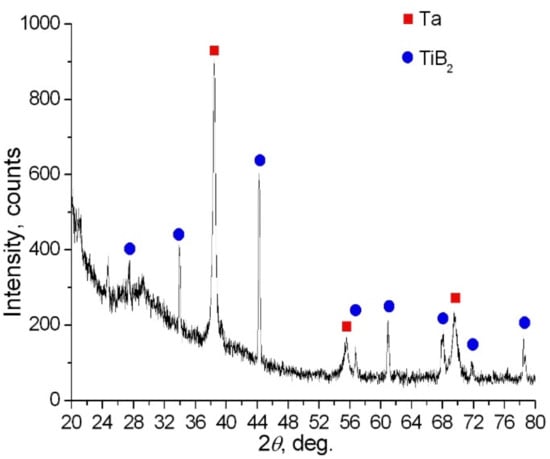 Figure 12 presents the fragment of cross section for a composite derived from Set 3, and Figure 13 shows its diffraction pattern. In this case, we managed to obtain a good joining of Ta foils with the newly formed TiB2 ceramics (Figure 12). The diffraction pattern in Figure 13 shows that the synthesized material contains bcc Ta (Im3m) [36] and TiB2 (P6/mmm) [38].