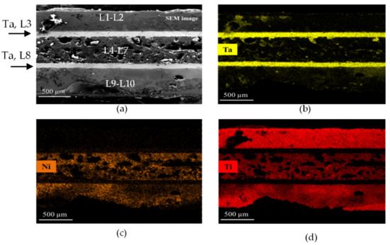 Our SEM/EDX results (Figure 4) confirmed the combustion-synthesized material represents a frame of Ta foils well joints by the interfacial Ti–Ta, Ti–Ni, and Ti–Ni–Ta layers. Despite a high temperature registered by thermocouples T1 and T2 (around 2900 °C), we observed no traces of Ta melting (m.p. 3017 °C). This can be associated with a high rate of wave propagation and heat sink into the environment. Elemental mapping in Figure 4 showed the distribution of Ta, Ti, and Ni over the cross section of Set 1.
