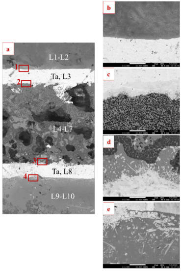 Microstructure of interlayer boundaries formed in cross section of burned Set 1: (a) a general view, (b) Ti–Ta interface at (L1–L2)–L3, (c) Ta–cermet interface at L3–(L4–L6), (d) (Ni + TiBx)–Ta interface at (L4–L7)–L8, and (e) Ta–Ni–Ti interface at L8–(L9–L10).