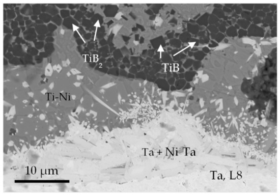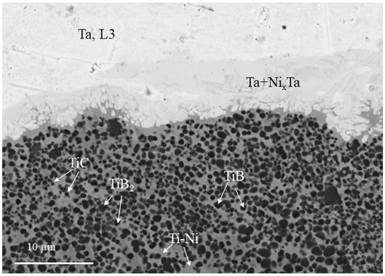 The microstructure of the Ta–cermet joint presented in Figure 8 (also corresponds to the Figure 5d, zone L5–L8, Set 1) illustrates the formation of well-pronounced transition layers without visible pores and cracks. In this case, the joint is seen to consist of three interlayers: between the cermet layer, consisting of TiB (cubic shape) and TiB2 (hexagonal shape) grains, uniformly distributed in the Ti–Ni matrix, and the Ta + NixTa solid solution layer, a Ti–Ni layer is formed.