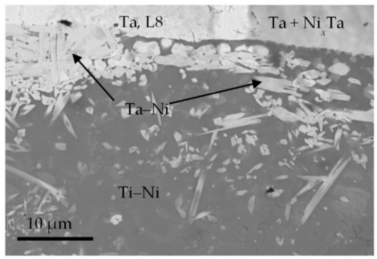Figure 9 (also corresponds to the Figure 5e) shows the microstructure of the Ta–Ni–Ti joint (zone L8–L10, Set 1). At the interface of Ta and Ni and Ti foils, we observed the melting of Ti and Ni foils and the formation of the Ti–Ni solution (Figure 9). This is accompanied by partial melting of the Ta foil and the diffusion of Ta atoms into the newly formed Ti–Ni solution.