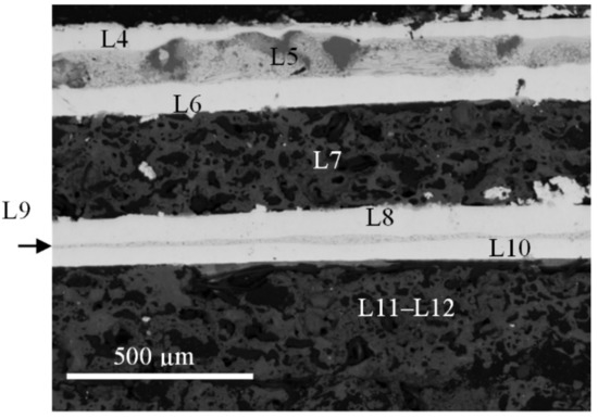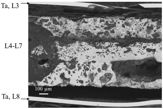 The cross section of burned sample formed in Set 2 illustrates the absence of joining between Ta (L3 and L8) and combustion products formed in layers L4–L7.