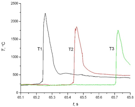 The structure of the sandwiches of Set 3 based on the use of Ti–Si reactive tapes is presented in Table 2. Figure 11 shows the readings of thermocouples T1–T3 (all installed between layers L8 and L9) during the combustion of Set 3 (Figure 1, Table 2). The T values in Figure 11 are close to those reported for 5Ti + 3Si mixture previously [32,33]. These results were used to determine the burning velocity in Ti–Si reactive tapes: U = 45–50 mm/s. Compared with Set 1, this is smaller by a factor of around three. Nevertheless, this fact did not prevent us from obtaining a good joint between Ta foils and titanium diboride.