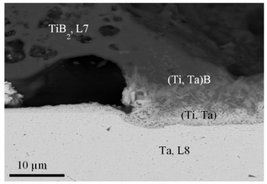 Figure 14 illustrates the microstructure of the Ta–TiB2 joint in Set 3. It is seen to consist of thin (3–5 μm) interlayers of (Ti,Ta) solution and interstitial (Ti,Ta)B phase. Partial substitution of Ti by Ta atoms becomes possible due to diffusional penetration of Ta atoms into the ceramic layer. According to [49], Ta atoms are capable of penetrating, at 1000 °C, to a depth of 11 μm in 10 min. In this case, the newly formed (Ti,Ta)B phase exhibited a microhardness of up to 30 GPa [49]. Therefore, despite some porosity of the transition layer (Figure 10), it is the formation of the (Ti,Ta) and (Ti,Ta)B phases that ensure the sample cohesion and integrity.