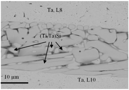 In conditions of diffusion bonding (1000–1500 °C), Ta and Si atoms were found to cover a distance of up to 30 μm from a Ta substrate [49,50]. In this case, the combustion-aided joining of Ta foil with Ti–Si ceramic was reached due to the formation of (Ti, Ta)Six solid solutions, although the TixSiy and TaxSiy could not be detected by XRD. Our Figure 15 demonstrates the formation of the grained structure formed by (Ti,Ta)Six compounds uniformly joined with Ta layers L8 and L10 without any visible interfacial phases. Such a joint promises good strength properties of synthesized materials at high temperatures.