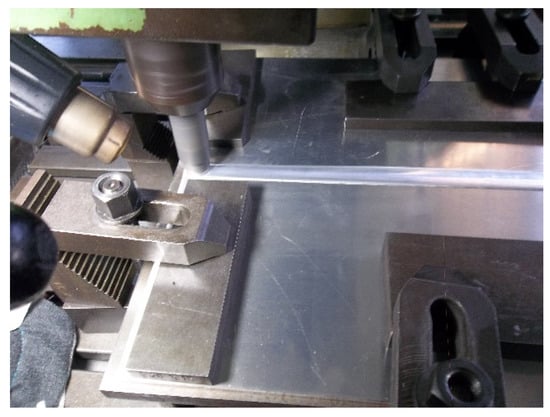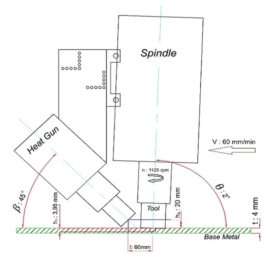 During the welding preparation stage, the first steps were conducted by installing the thermocouple on the backing plate and by setting the temperature measuring device. The backing plate was installed on the milling machine table. The next step involved the installation of the base metal above the back-side plate and clamping in order to ensure that it remained fixed to the plats. The position of the plate was adjusted using a dial indicator. Then, the tool, a Bosch heat gun CHG 630 DCE (Robert Bosch GmbH, Gerlingen, Germany), was installed, and the machine parameter settings are schematically shown in Figure 2. The tool was adjusted so that it was right on the welding line (joint line).