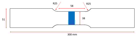 Additionally, a tensile test was carried out to determine the tensile strength of the welding results using a Universal Testing Machine type SHT 4106 (MTS/LABSANS, Guangdong, China). The specimen was placed in the workpiece clamp, and careful attention was given to ensuring that the weld joint line was precisely between the two clamps. Figure 6 shows the dimensions of the tensile test specimens.
