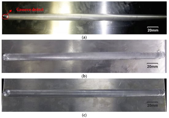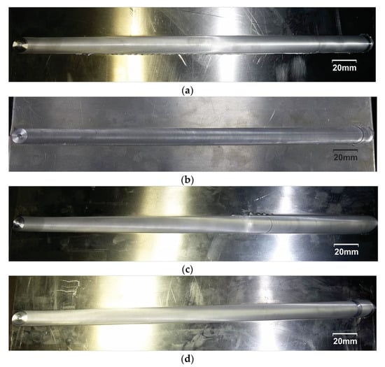 For the last experiment, welding was carried out on a cylindrical pin with three flat sides at the preheating temperatures of 150 °C, 200 °C, 250 °C, and 300 °C, with the same welding parameters as those mentioned above. The welded joints of the pin profiles with three flat sides and for three different preheat temperatures are shown in Figure 13. There are no visible defects on the welding surfaces.