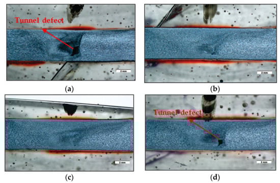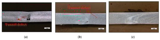 Figure 12 shows macro photos of the two-flat-sided pin profile and the different preheating variations at 150 °C, 200 °C, 250 °C, and 300 °C. The macro photos that were taken at the 150 °C preheat variation show a welding defect in the form of a tunnel defect. On the other hand, the macro photos that were taken at the preheating variations of 200 °C, 250 °C, and 300 °C do not show any defects.