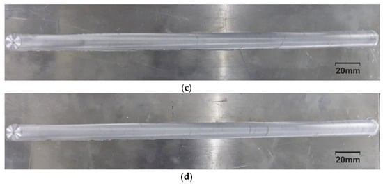 Macro photo data of the pin profile with three flat sides at preheating temperatures of (a) 150 °C, (b) 200 °C, (c) 250 °C, and (d) 300 °C (scale in (a–d) is 2 mm).