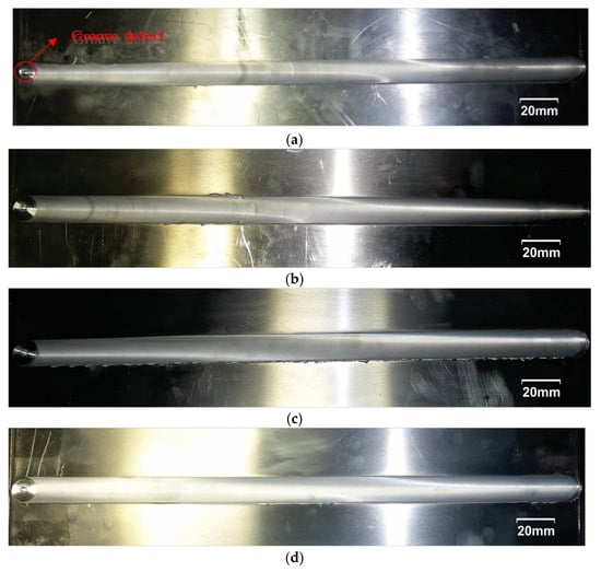 Similar results can be determined from the macro photos. Figure 14 shows the results of the macro photos that were taken of a pin profile with three flat sides and preheating temperatures of 150 °C, 200 °C, 250 °C, and 300 °C. The macro photos show no defects, regardless of the preheating temperature