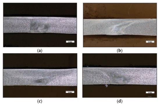 Welded joints of a pin profile with two flat sides at the preheating temperatures of (a) 150 °C, (b) 200 °C, (c) 250 °C, and (d) 300 °C.