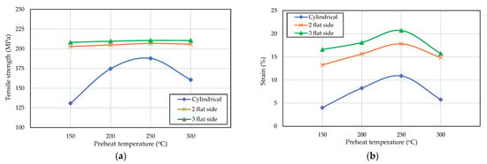 Figure 17a shows that the highest strength was achieved by a three-flat-sided pin profile with an initial temperature variation of 250 °C at 211.2 MPa, and the lowest strength was achieved by a cylindrical pin profile with an initial temperature variation of 150 °C at 131.8 MPa. This could have been caused by the concentration of stress creating defects in the weld joint. The cylindrical and two-flat-sided pin profiles without preheating and with preheating at 150 °C demonstrated tunnel defects, which resulted in low tensile strength, namely 128.3 MPa, 131.8 MPa, and 203.6 MPa. The three-flat-sided pin profile specimen demonstrated the highest test results compared to other specimens: 208.9 MPa, 210.1 MPa, 211.2 MPa, and 210.8 MPa.