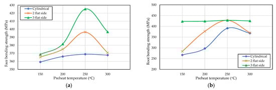 During the face bending test, the top of the weld seam of the specimen faces downwards, and the pressed part is the reverse surface. A comparison of face bending strength is shown in Figure 18a. The highest face bending strength value was determined for the three-flat-sided pin at the initial temperature 250 °C, with the value of 425.3 MPa, and the lowest value was determined for the cylindrical pin when no preheating was induced, with a value of 368.8 MPa. This conclusion was reached because in the variation at the preheating temperature of 250 °C, the three-flat-sided pin produced a connection with no visible defects and demonstrated the highest tensile and bending strength.