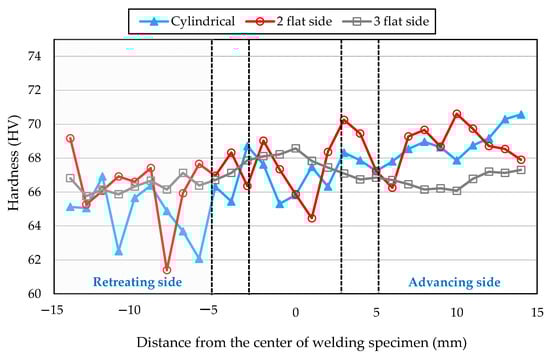The hardness test in this study used a micro Vickers machine. Figure 19 and Figure 20 show that the hardness value at each test point had a relatively asymmetric value. Muhayat et al. [] explained that an asymmetric hardness is the result of a difference in the welding temperature between the advancing and retreating sides. The lowest average hardness value was found in the specimens that were obtained at the preheating temperature of 300 °C for each pin profile variation. This is the result of the slower cooling rate, which results in the grain size being larger, meaning that it has less of an impact on the hardness. The average maximum hardness was achieved at a heating temperature of 250 °C. This is relevant to the tensile test results that were determined for each pin profile variation. The hardness characteristics increase as the preheating temperature increases due to grain refinement in the stirring area. This consideration may be extended to the thin-walled structure welding, e.g., ship, on offshore, and other vital structures [,,,,,,,].