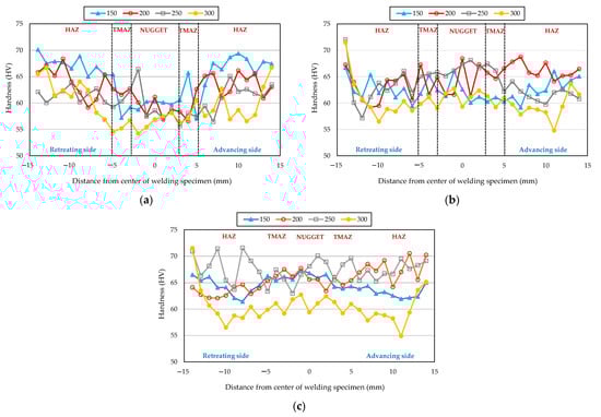 Comparison of hardness test results at different preheat temperatures: (a) cylindrical pin profile, (b) two-flat-sided, and (c) three-flat-sided pin profiles.